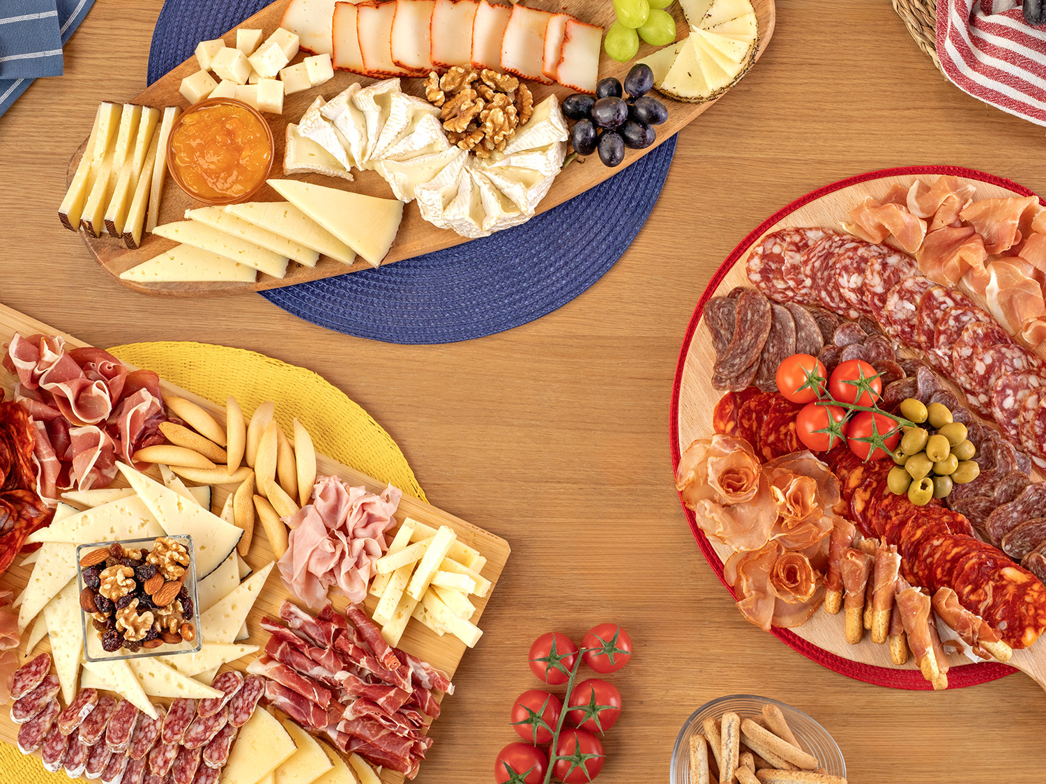 - Ahora equilibra la tabla con acompañamientos frescos y crujientes como tomatitos cherry para aportar un toque fresco y color vibrante. Añade un punto salino con las aceitunas verdes sin hueso Baresa y coloca los picos integrales Tastino envueltos por la mitad con algunas lonchas de jamón serrano.