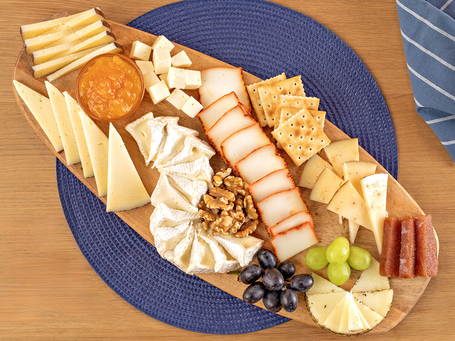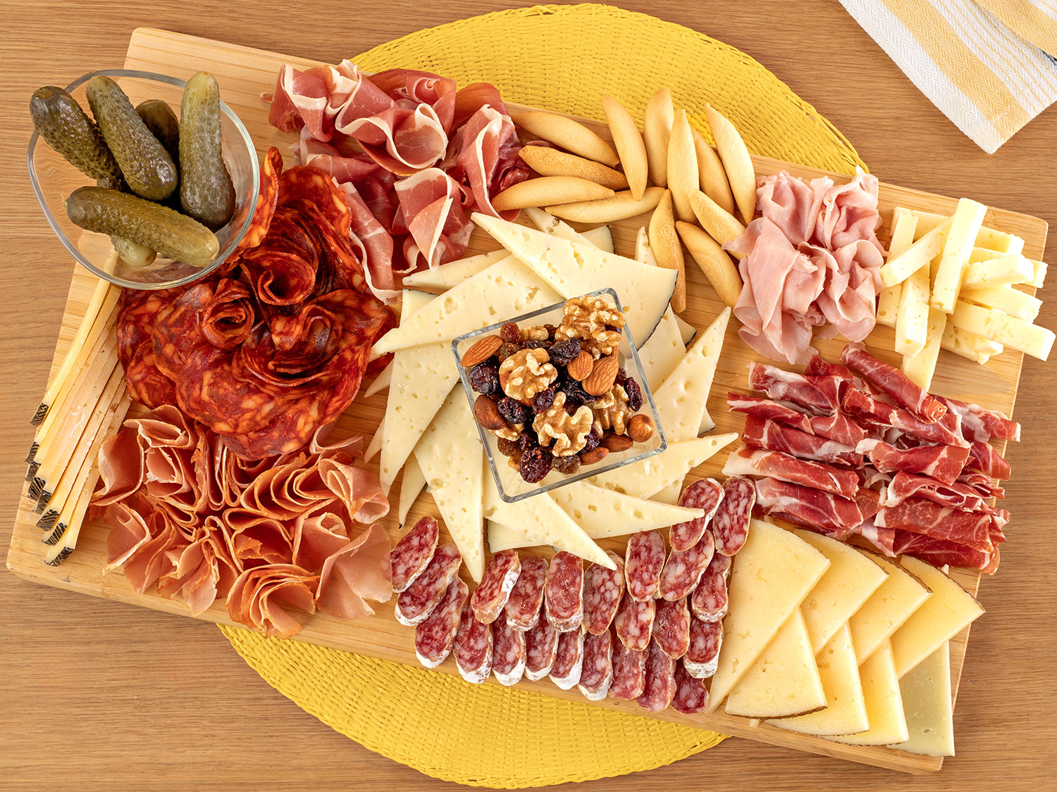- Selecciona una tabla de madera rectangular que te ayude a contrastar con los tonos rojizos del embutido y los tonos beige y blanco del queso.